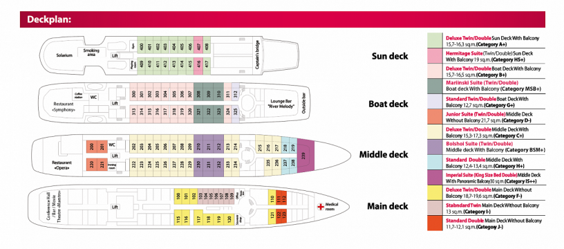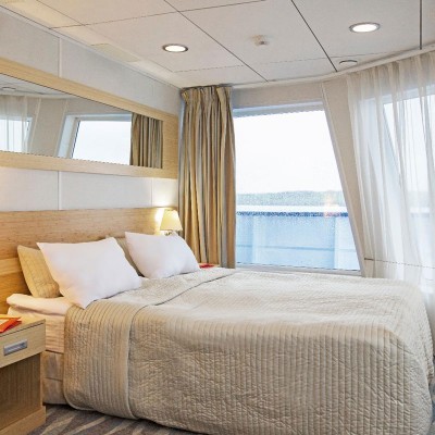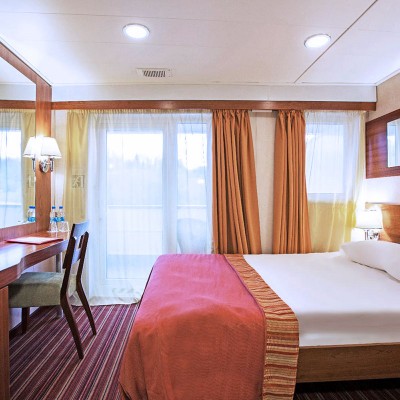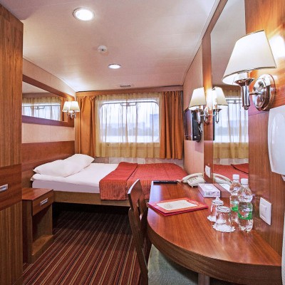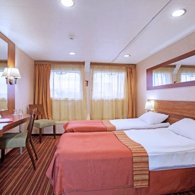 Tutte le cabine sono dotate di ampie finestre che si affacciano all'esterno e permettono di ammirare i magnifici paesaggi incontaminati della Russia. Alcune cabine sono dotate di un balcone. Tutte le cabine sono molto confortevoli. Hanno servizi privati con wc, lavabo e doccia. Inoltre sono attrezzate con aria condizionata, frigorifero, radio in filodiffusione e uno spazioso armadio.